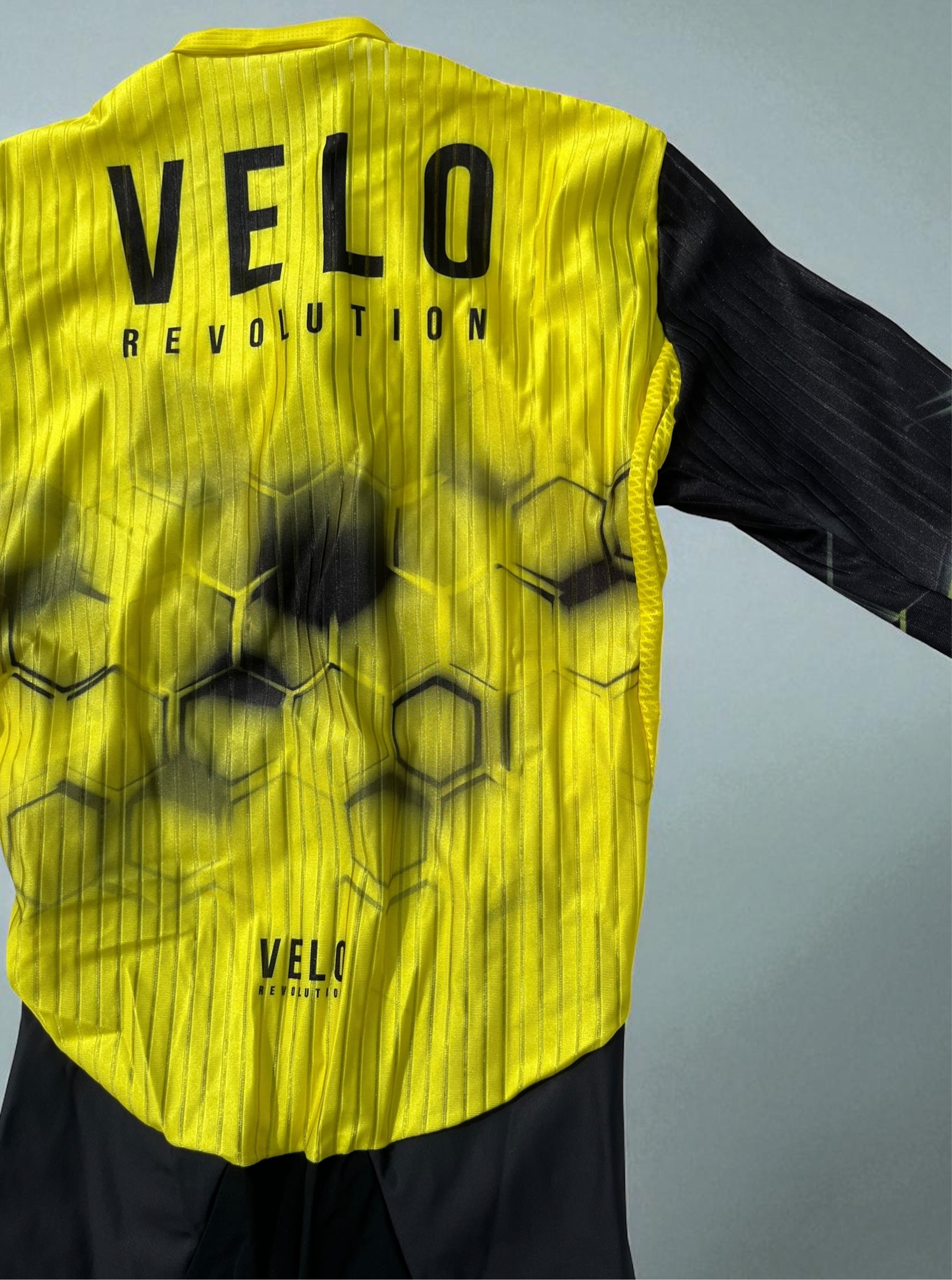 Color: BLACK BOTTOMS, BLACK AERO SLEEVES with a YELLOW TORSO TOP with Black Honeycomb features