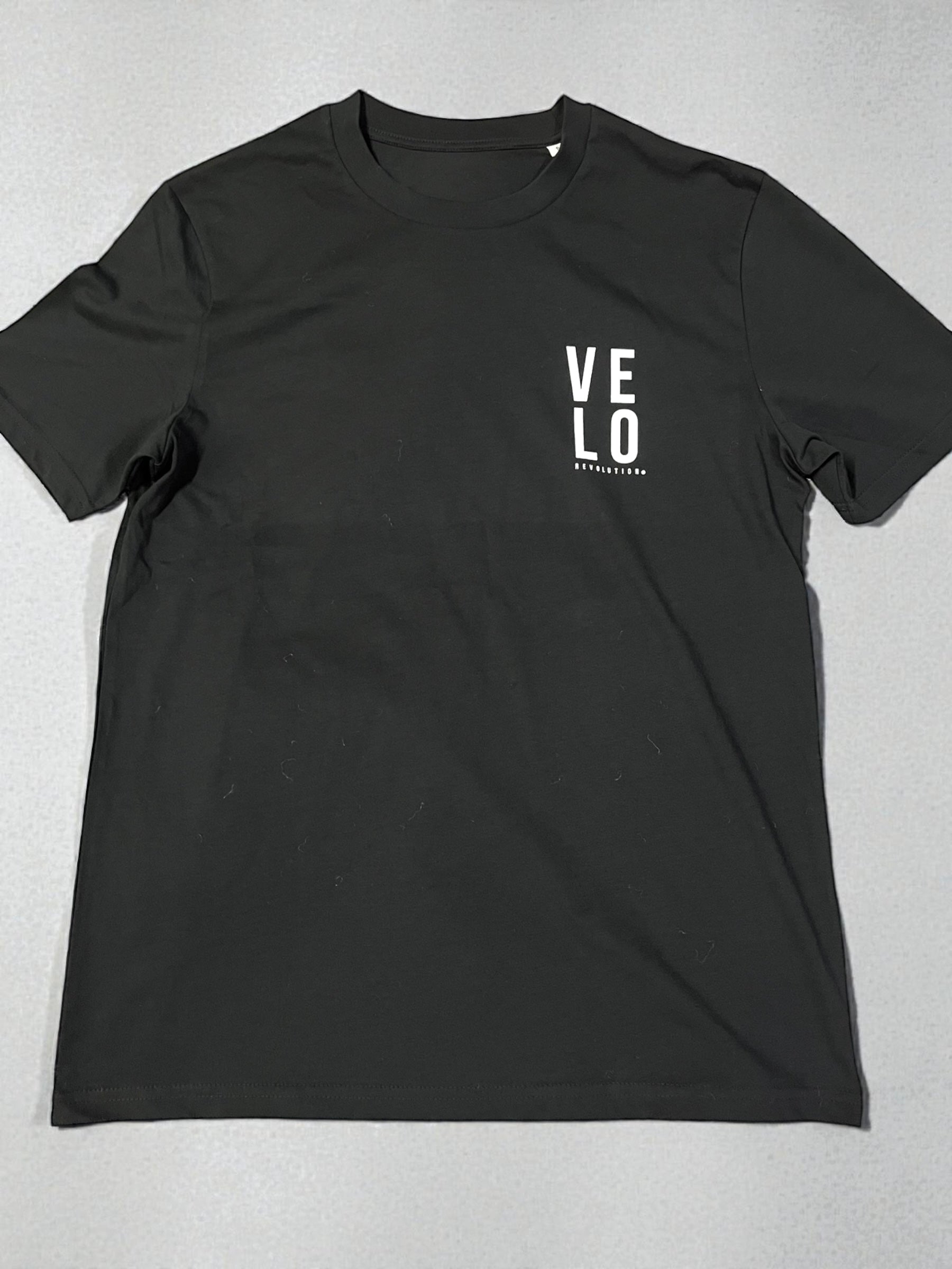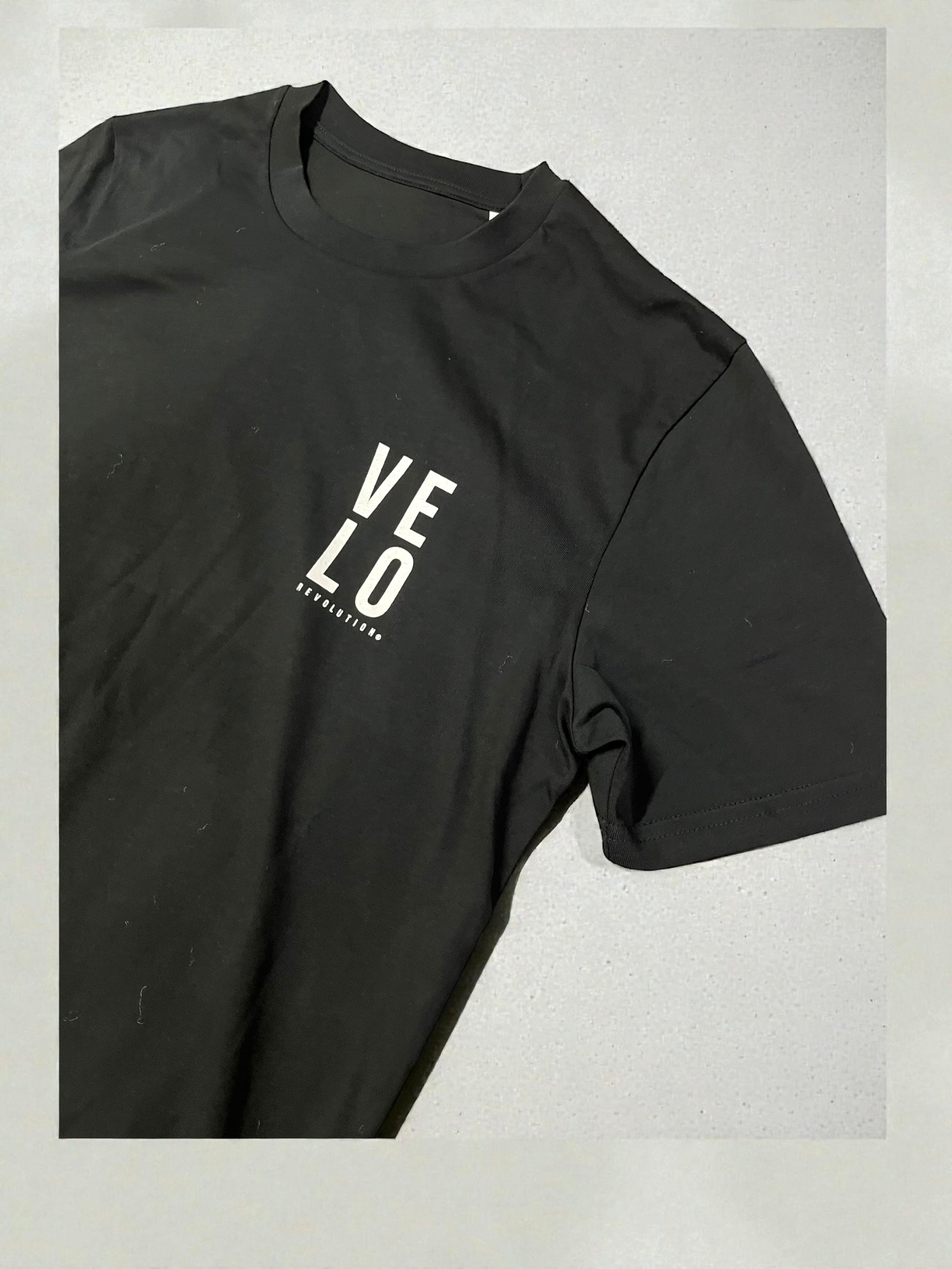 Color: BLACK TEE with our Brand Letters V E L O in White as a feature over REVOLUTION.